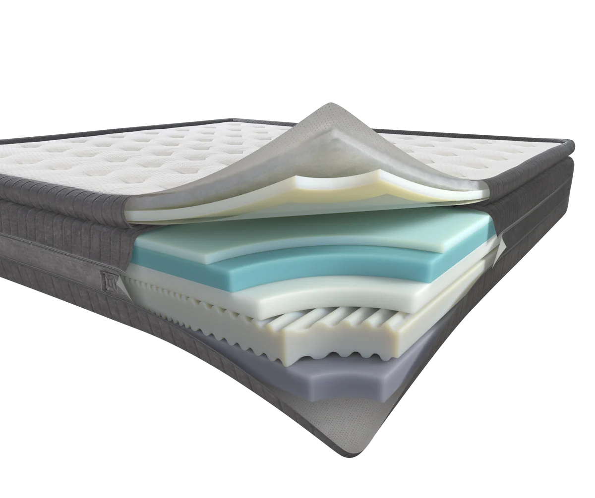 Stratul superior din Myform Memory Air ameliorează punctele de presiune, oferind o senzație plăcută, în timp ce Myform Extension asigură un suport elastic și stabil.